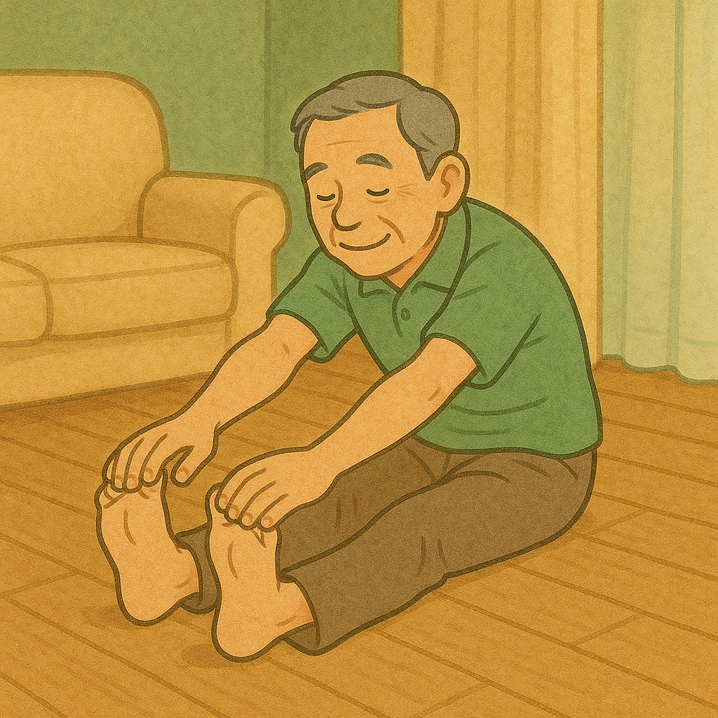 - 座って前屈ストレッチ:椅子に座り、ゆっくり背中を丸めて前に倒れる。腰が痛まない範囲で